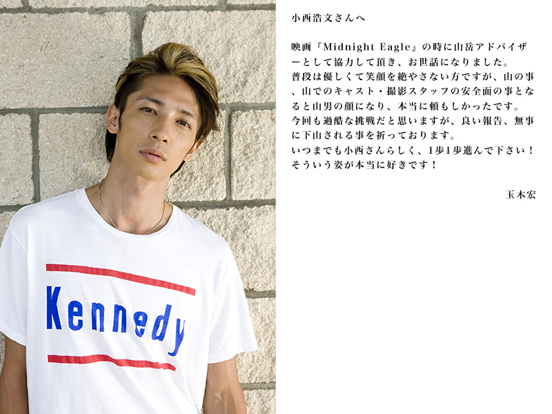小西さんの登山が、これからも続く様に、俳優としての僕の登山も続きます。小西さんが命を賭けて山を登る様に、僕も人生を賭けて、僕の考える頂を目指します。芯から熱い男で、お酒を飲むとお茶目で、よく笑い、よく食べ、よく歌う、そして何より仲間をとても大切にする小西浩文さんに出会えたことに「男道」の神様に感謝しています。